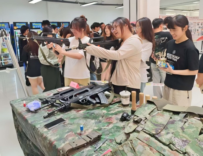 互动区战术装备试穿人气爆棚,学子们争相穿戴拍照,沉浸式体验军人风采。